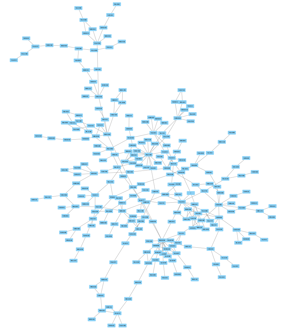 The network nodes are by default labeled with yeast ORF identifiers. We can change the label to something more readible, like the gene symbol.