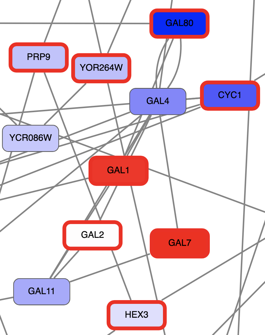 Digging into the biology of this network, it turns out that GAL4 is repressed by GAL80. Both GAL4 and GAL11 show fairly small changes in expression, and neither change is statistically significant: they are pale blue with thin borders. These slight changes in expression suggest that the critical change affecting the red nodes might be somewhere else in the network, and not either of these nodes. GAL4 interacts with GAL80, which shows a significant level of repression: it is medium blue with a thicker border.