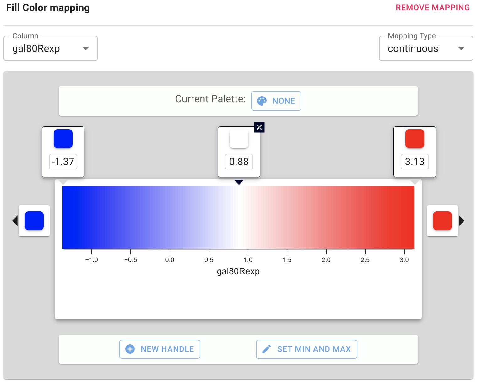 This produces a default ColorBrewer gradient ranging from blue to red for expression values. For our purposes, this gradient works so we don't need to edit it. Click anywhere in browser window to exit the Fill Color Mapping interface.