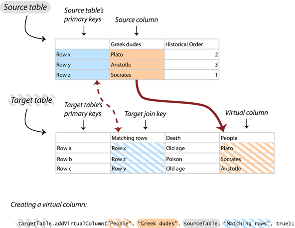 You can share the contents of a column in one table with another table. These are called virtual columns. If cell values change in one virtual column, all other tables with that virtual column will change too. Virtual columns are used to share data between networks.